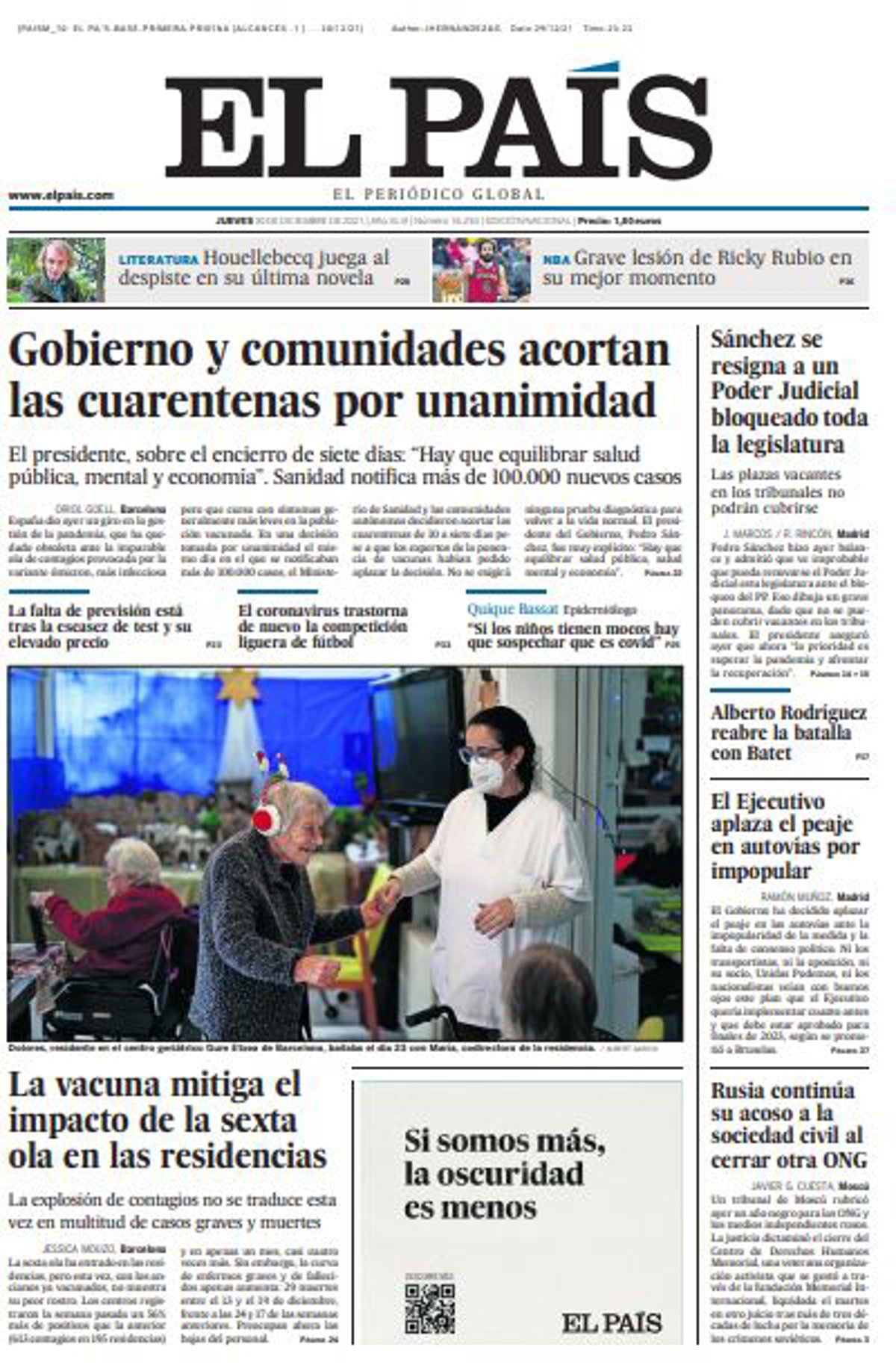 EL PAÍS: "Gobierno y comunidades acortan las cuarentenas por unanimidad"; "La vacuna mitiga el impacto de la sexta ola en las residencias"; "Sánchez se resigna a un Poder Judicial bloqueado toda la legislatura"; "Alberto Rodríguez reabre la batalla con Batet"; "El Ejecutivo aplaza el peaje en autovías por impopular"; "Rusia continúa