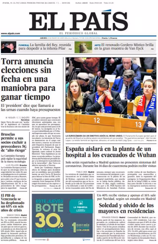 EL PAÍS: "Torra anuncia elecciones sin fecha en una maniobra para ganar tiempo"; "España aislará en la planta de un hospital a los evacuados de Wuhan"; "Bruselas permite a sus socios excluir a proveedores 5G de "alto riesgo"; "El PIB de Venezuela se ha desplomado un 65% en seis años de crisis"; "Soledad y olvido de los mayores en residencias".