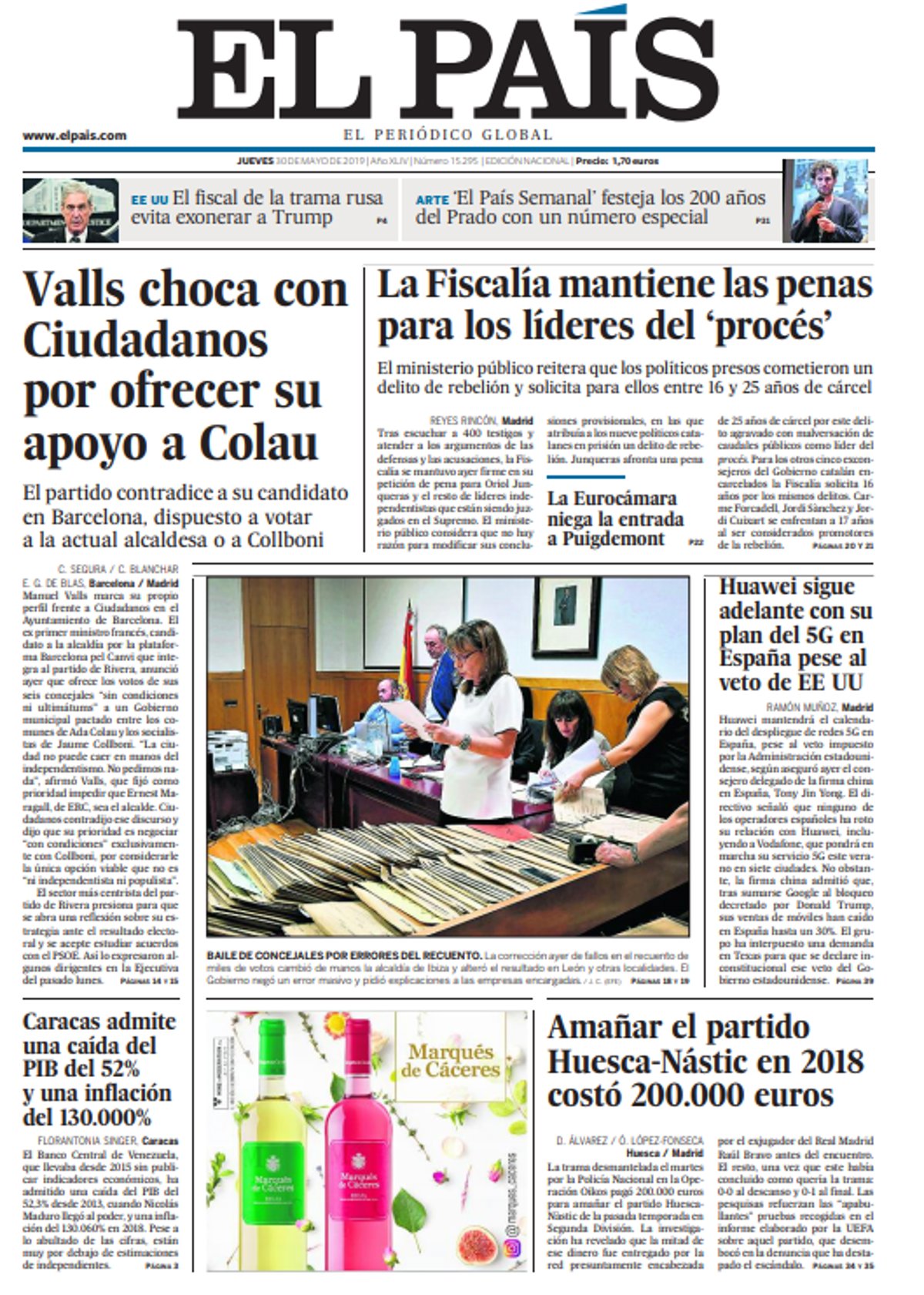 EL PAÍS: "Valls choca con Ciudadanos por ofrecer su apoyo a Colau"; "La Fiscalía mantiene las penas para los líderes del 'procés'"; "Huawei sigue adelante con su plan del 5G en España pese al veto de EE UU"; "Caracas admite una caída del PIB del 52% y una inflación del 130.000%"; "Amañar el partido Huesca-Nástic en 2018 costó 200.000 euros".