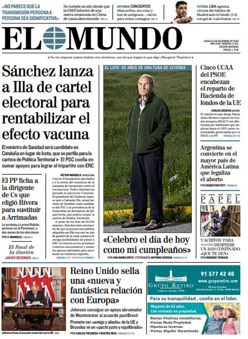 EL MUNDO: "Sánchez lanza a Illa de cartel electoral para rentabilizar el efecto vacuna"; "El PP ficha a la dirigente de Cs que eligió Rivera para sustituir a Arrimadas"; "Reino Unido sella una "nueva y fantástica relación con Europa""; "Cinco CCAA del PSOE encabezan el reparto de Hacienda de fondos de la UE"; "Argentina se convierte en el mayor país de América Latina que legaliza el aborto"; "El Lute: 50 años de una fuga de leyenda: "Celebro el día de hoy como mi cumpleaños"".