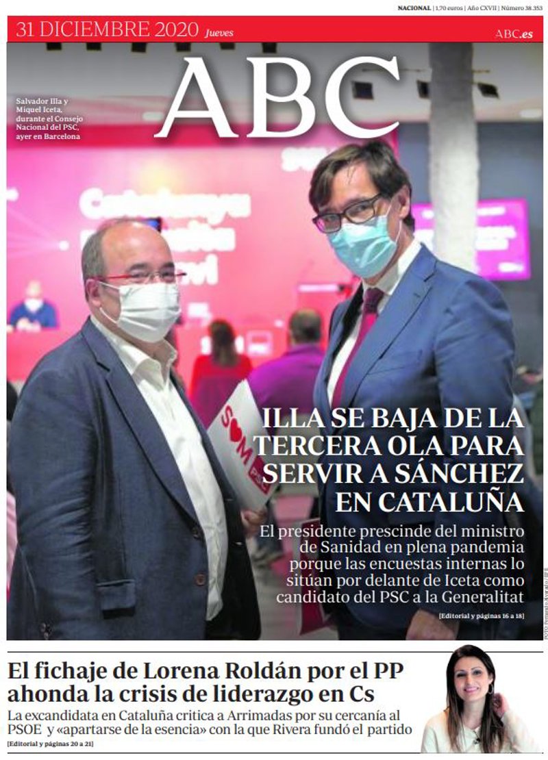ABC: "Illa se baja de la tercera ola para servir a Sánchez en Cataluña. El presidente prescinde del ministro de Sanidad en plena pandemia porque las encuestas internas lo sitúan por delante de Iceta como candidato del PSC a la Generalitat"; "El fichaje de Lorena Roldán por el PP ahonda la crisis de liderazgo en Cs. La excandidata en Cataluña critica a Arrimadas por su cercanía al PSOE y "apartarse de la esencia" con la que Rivera fundó el partido"..