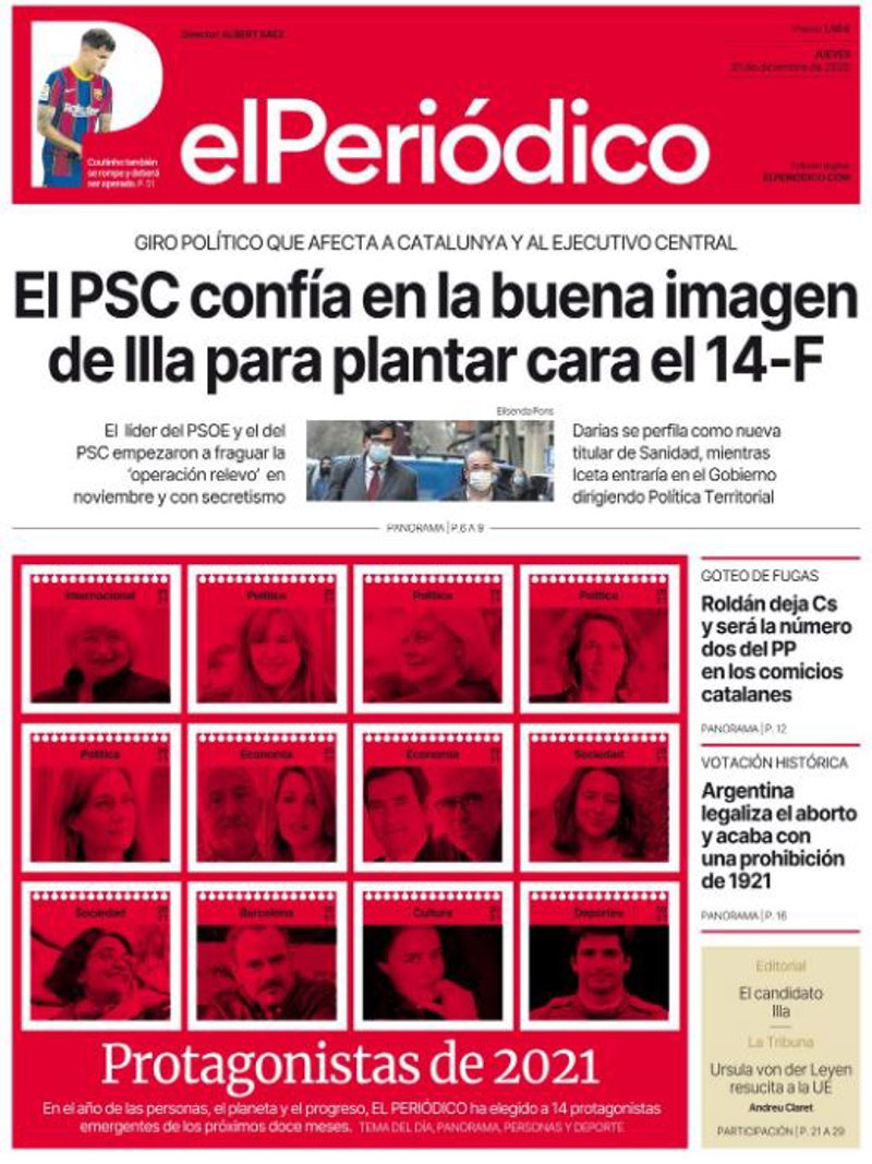 EL PERIÓDICO: "El PSC confía en la buena imagen de Illa para plantar cara el 14-F"; "Roldán deja Cs y será la número dos del PP en los comicios catalanes"; "Argentina legaliza el aborto y acaba con una prohibición de 1921"; "Protagonistas de 2021".