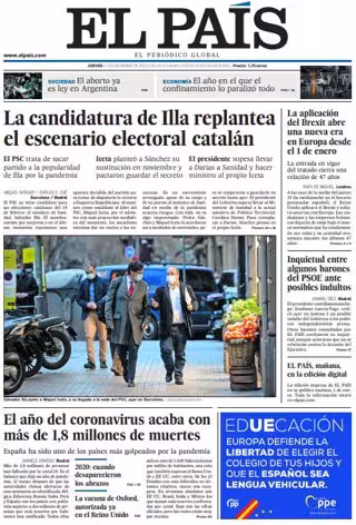 EL PAÍS: "La candidatura de Illa replantea el escenario electoral catalán"; "El año del coronavirus acaba con más de 1,8 millones de muertes"; "La aplicación del Brexit abre una nueva era en Europa desde el 1 de enero"; "Inquietud entre algunos barones del PSOE ante posibles indultos"; "EL PAÍS, mañana, en la edición digital".