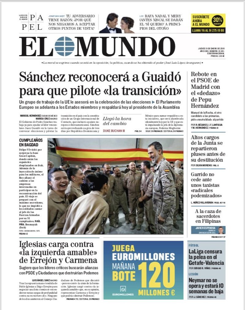 EL MUNDO: "Sánchez reconocerá a Guaidó para que pilote 'la transición'"; "Rebote en el PSOE de Madrid con el 'dedazo' de Pepu Hernández"; "Altos cargos de la Junta se repartieron pluses antes de su destitución"; "Iglesias carga contra 'la izquierda amable' de Errejón y Carmena".