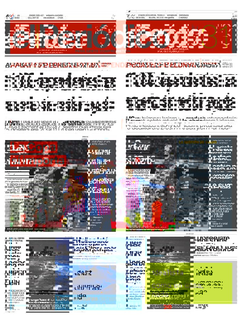 EL PERIÓDICO: "11.000 dependientes han muerto sin recibir ayuda"; "La Copa sí importa. Un Barça motivado remonta con una goleada al Sevilla (6-1) y el Espanyol cae eliminado ante el Betis (3-1)"; "El exdirector de Infància benefició a una exconsellera de Esquerra"; "Iglesias recula y aboga por pactar con Errejón"; "Temperaturas de hasta -30º congelan el Medio Oeste de EEUU"; "El Mobile se planteó dejar BCN por el procés".