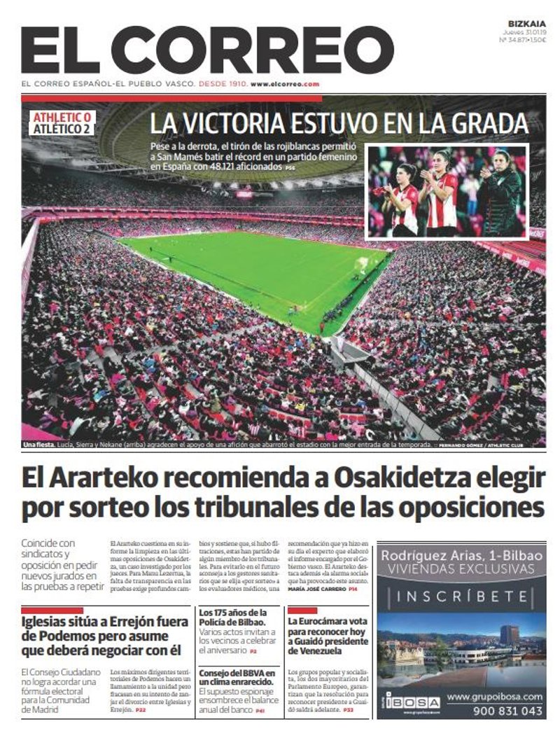 EL CORREO: "El Ararteko recomienda a Osakidetza elegir por sorteo los tribunales de las oposiciones"; "Iglesias sitúa a Errejón fuera de Podemos pero asume que deberá negociar con él"; "La Eurocámara vota para reconocer hoy a Guaidó presidente de Venezuela"; "La victoria estuvo en la grada".