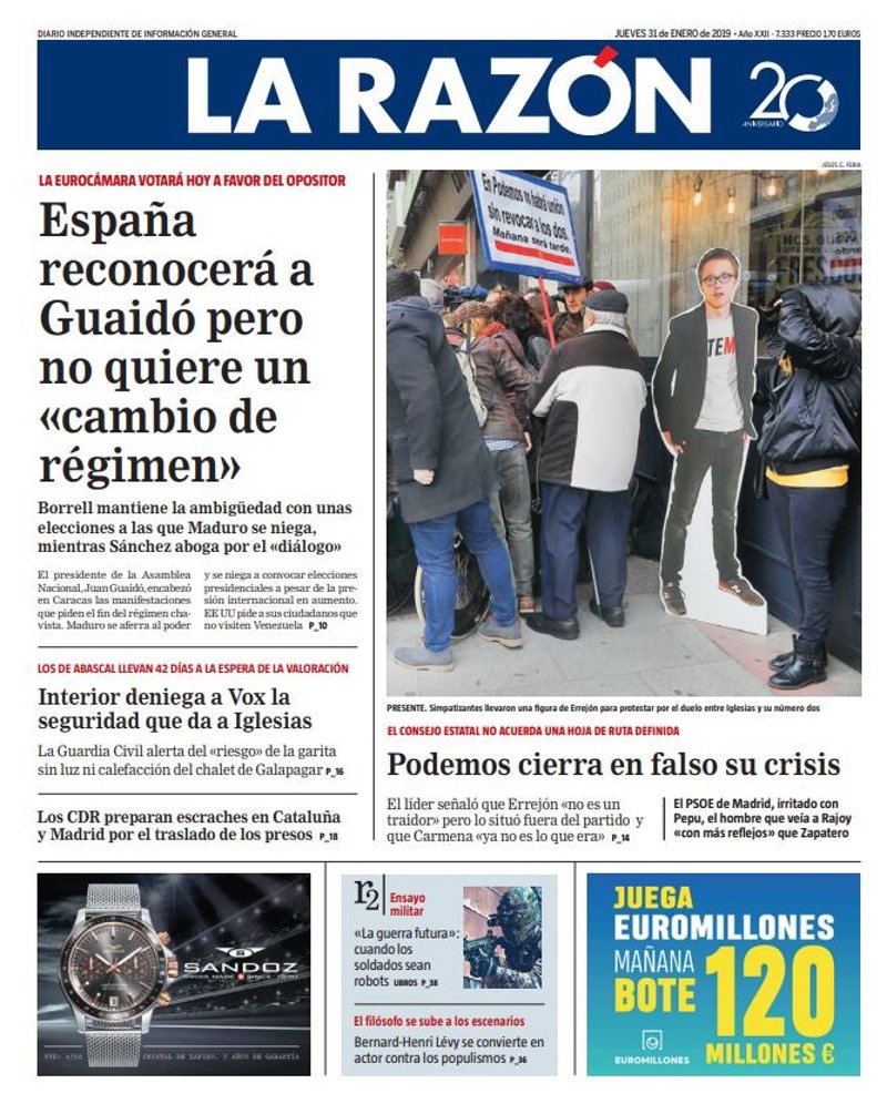 LA RAZÓN: "España reconocerá a Guaidó pero no quiere un 'cambio de régimen'"; "Interior deniega a Vox la seguridad que da a Iglesias"; "Los CDR preparan escraches en Cataluña y Madrid por el traslado de los presos"; "El PSOE de Madrid, irritado con Pepu, el hombre que veía a Rajoy 'con más reflejos' que Zapatero".