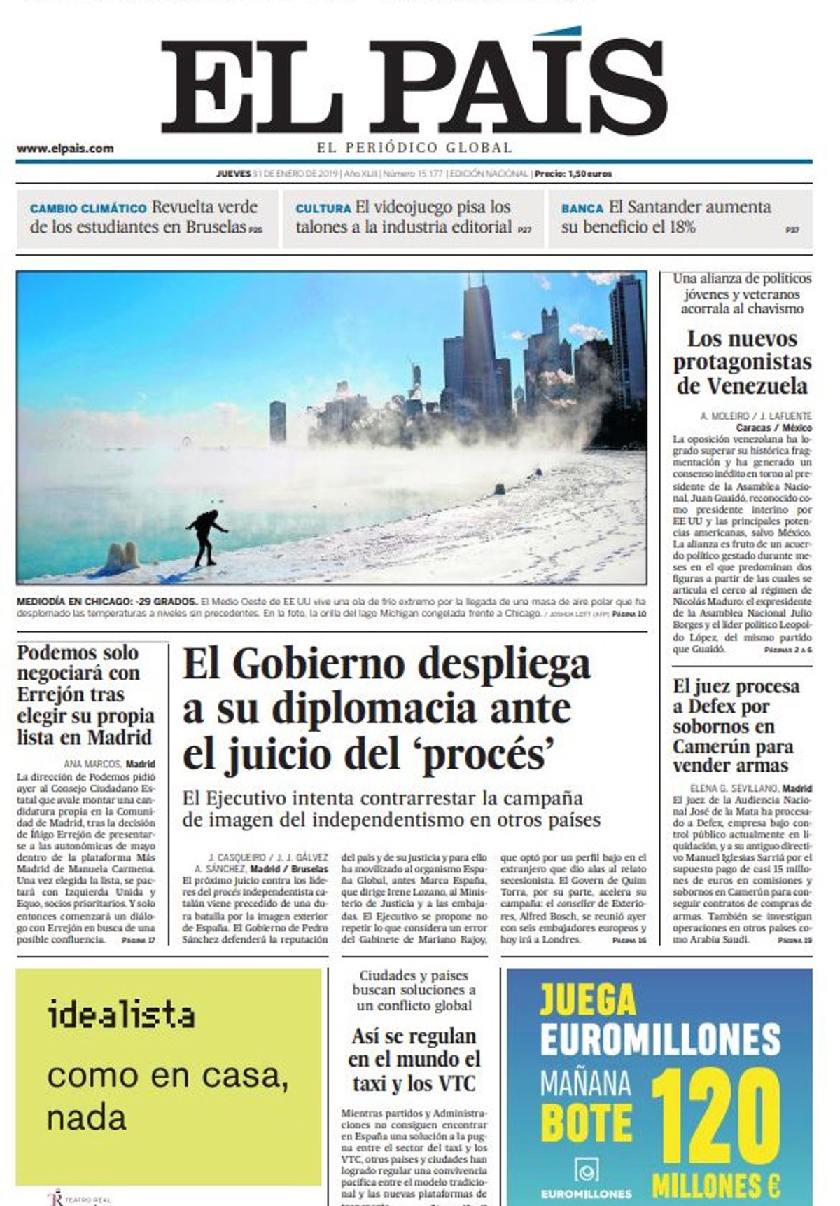 EL PAÍS: "El Gobierno despliega a su diplomacia ante el juicio del 'procés'"; "Podemos solo negociará con Errejón tras elegir su propia lista en Madrid"; "Los nuevos protagonistas de Venezuela"; "El juez procesa a Defex por sobornos en Camerún para vender armas"; "Así se regulan en el mundo el taxi y los VTC".