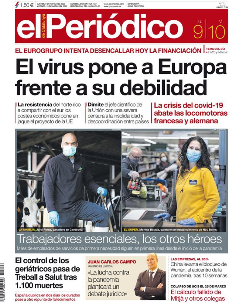 EL PERIÓDICO: "El virus pone a Europa frente a la debilidad. La crisis del covid-19 abate las locomotoras francesa y alemana"; "Trabajadores esenciales, los héroes"; "El control de los geriátricos pasa de Treball a Salut tras 1.100 muertes"; "Juan Carlos Campo, ministro de Justicia: "La lucha contra la pandemia planteará un debate jurídico""; "China levanta el bloqueo de Wuhan, el epicentro de la pandemia, tras 10 semanas"; "Colapso de UCIs el 25 de marzo. El cálculo fallido de Mitjà y otros colegas".