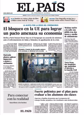 EL PAÍS: "El bloqueo en la UE para lograr un pacto amenaza su economía. Alemania y Francia, los dos grandes motores de la eurozona, se adentran en la recesión"; "Repunte de muertes y contagios en unos datos cuestionados"; "Fuerte polémica por el plan para evaluar a los alumnos sin clases"; "Hacienda plantea aplazar impuestos a pymes y autónomos"; "Wuhan vuelve a la calle con júbilo tras dos meses y medio de aislamiento"; "Torra frena dos hospitales que montaban el Ejército y la Guardia Civil".
