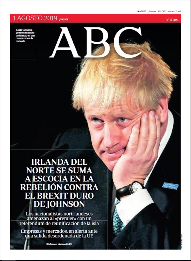 ABC: "Irlanda del Norte se suma a Escocia en la rebelión contra el Brexit duro de Johnson. Los nacionalistas norirlandeses amenazan al "premier" con un referéndum de reunificación de la isla. Empresas y mercados, en alerta ante una salida desordenada de la UE".