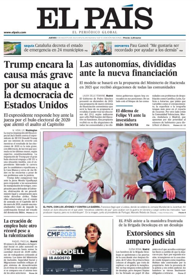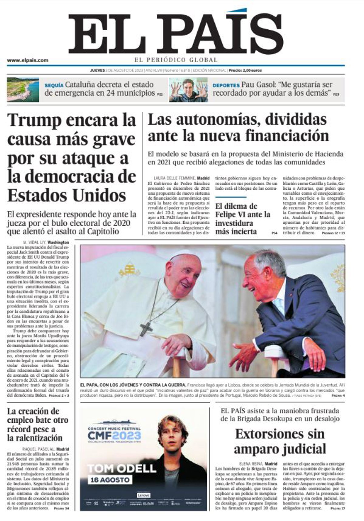 EL PAÍS: "Trump encara la causa más grave por su ataque a la democracia de Estados Unidos"; "Las autonomías, divididas ante la nueva financiación"; "La creación de empleo bate otro récord pese a la ralentización"; "El dilema de Felipe VI ante la investidura más incierta"; "Extorsiones sin amparo judicial".