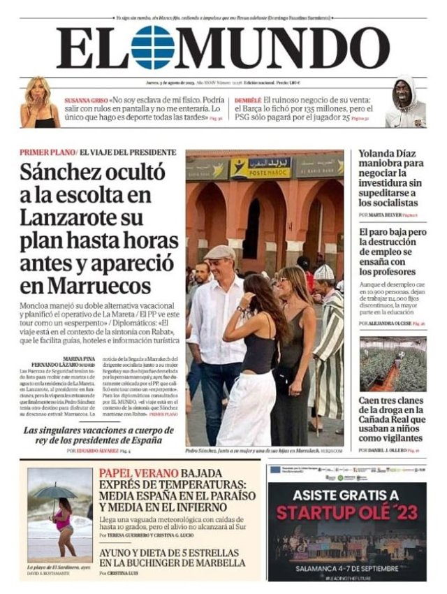 EL MUNDO: "Sánchez ocultó a la escolta en Lanzarote su plan hasta horas antes y apareció en Marruecos"; "Yolanda Díaz maniobra para negociar la investidura sin supeditarse a los socialistas"; "El paro baja pero la destrucción de empleo se ensaña con los profesores"; "Caen tres clanes de la droga en la Cañada Real que usaban a niños como vigilantes".