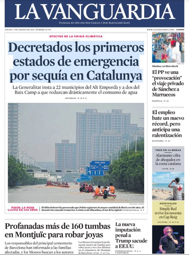 LA VANGUARDIA: "Decretados los primeros estados de emergencia por sequía en Catalunya"; "Profanadas más de 160 tumbas en Montjuïc para robar joyas"; "La nueva imputación penal a Trump sacude a EEUU"; "El PP ve una "provocación" el viaje privado de Sánchez a Marruecos"; "El empleo bate un nuevo récord, pero anticipa una ralentización".