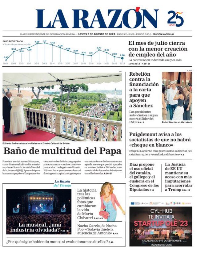 LA RAZÓN: "Baño de multitud del Papa"; "El mes de julio cierra con la menor creación de empleo del año"; "Rebelión contra la financiación a la carta para que apoyen a Sánchez"; "Puigdemont avisa a los socialistas de que no habrá cheque en blanco"; "Díaz propone el uso oficial del catalán, el gallego y el euskera en el Congreso de los Diputados"; "La Justicia de EE UU mantiene su acoso con más imputaciones para acorralar a Trump".