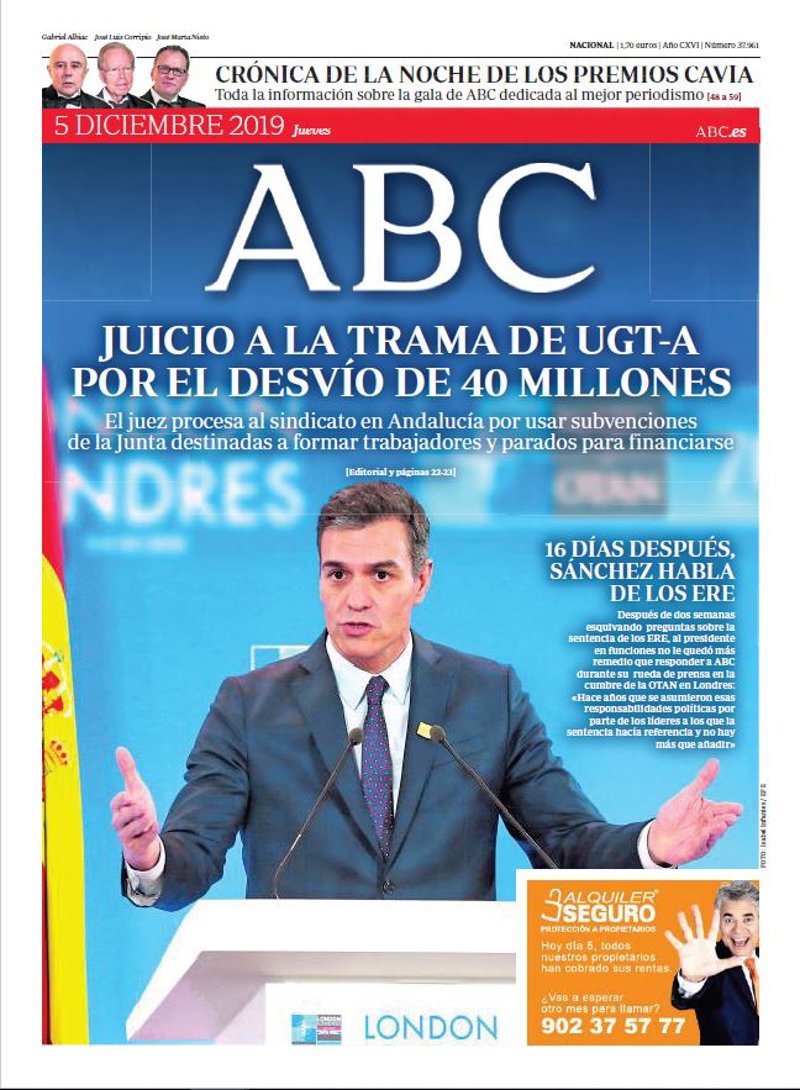 ABC: "Juicio a la trama de UGT-A por el desvío de 40 millones. El juez procesa al sindicato en Andalucía por usar subvenciones de la Junta destinadas a formar trabajadores y parados para financiarse. 16 días después, Sánchez habla de los ERE".