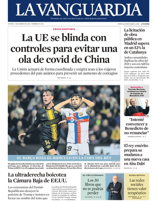 LA VANGUARDIA: "La UE se blinda con controles para evitar una ola de covid de China"; "La licitación de obra pública en Madrid supera en un 52% la de Catalunya"; "El rey emérito prepara su mudanza a una nueva casa en Abu Dabi"; "La ultraderecha boicotea la Cámara Baja de EEUU".