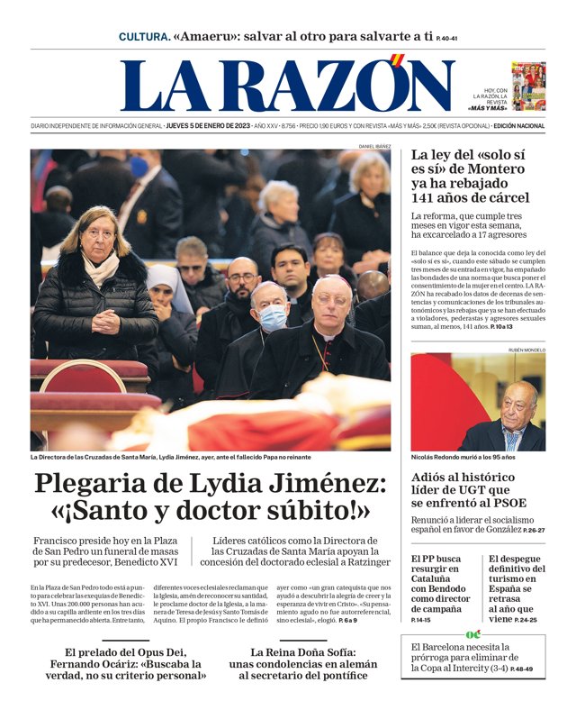 LA RAZÓN: "La ley del 'solo sí es sí' de Montero ya ha rebajado 141 años de cárcel"; "Plegaria de Lydia Jiménez: ¡Santo y doctor súbito!"; "Adiós al histórico líder de UGT que se enfrentó al PSOE"; "El PP busca resurgir en Cataluña con Bendodo como director de campaña"; "El despegue definitivo del turismo en España se retrasa al año que viene".