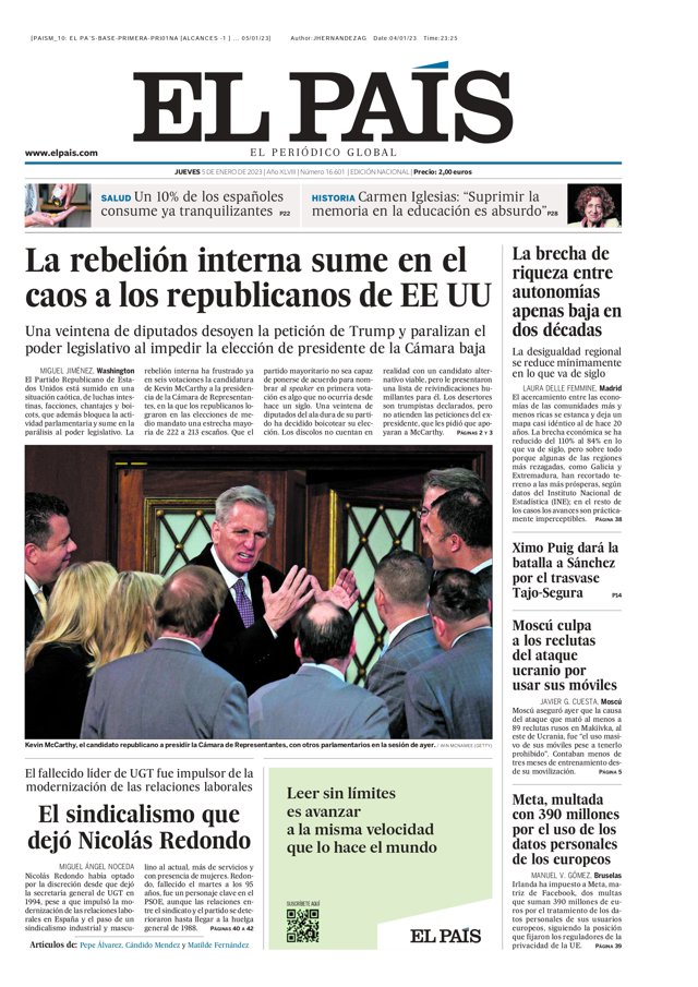 EL PAÍS: "La rebelión interna sume en el caos a los republicanos de EEUU"; "La brecha de riqueza entre autonomías apenas baja en dos décadas"; "Ximo Puig dará la batalla a Sánchez por el trasvase Tajo-Segura"; "Moscú culpa a los reclutas del ataque ucranio por usar sus móviles"; "El sindicalismo que dejó Nicolás Redondo"; "Meta, multada