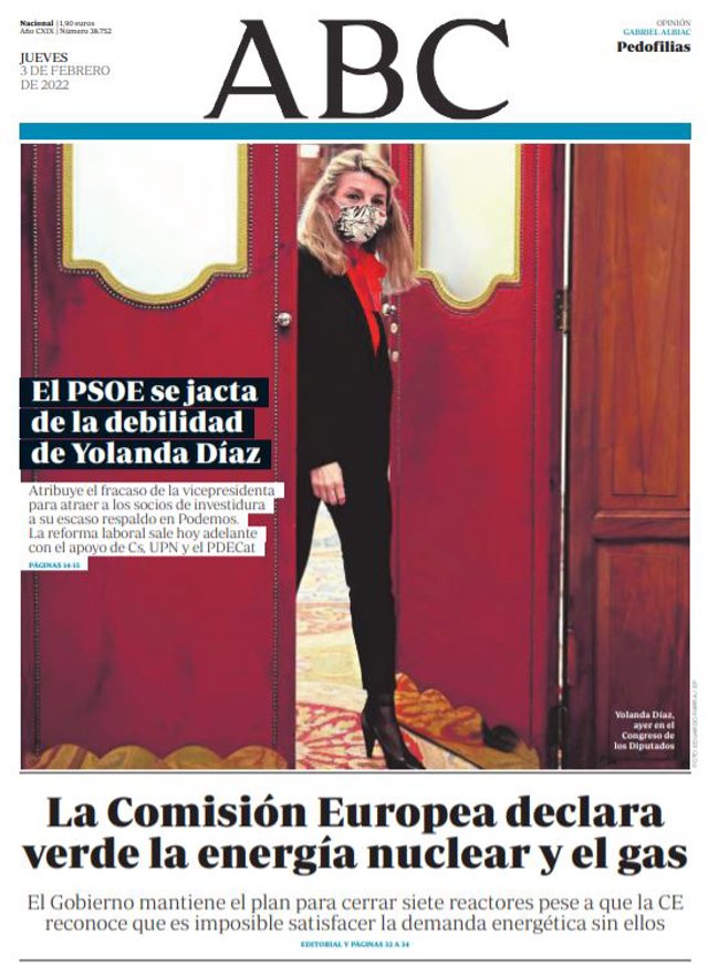 ABC: "El PSOE se jacta de la debilidad de Yolanda Díaz"; "La Comisión Europea declara verde la energía nuclear y el gas".