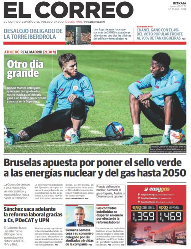 EL CORREO: "Otro día grande"; "Bruselas apuesta por poner el sello verde a las energías nuclear y del gas hasta 2050"; "Sánchez saca adelante la reforma laboral gracias a Cs, PDeCAT y UPN"; "Los contratos indefinidos se disparan en enero por efecto de la reforma laboral".