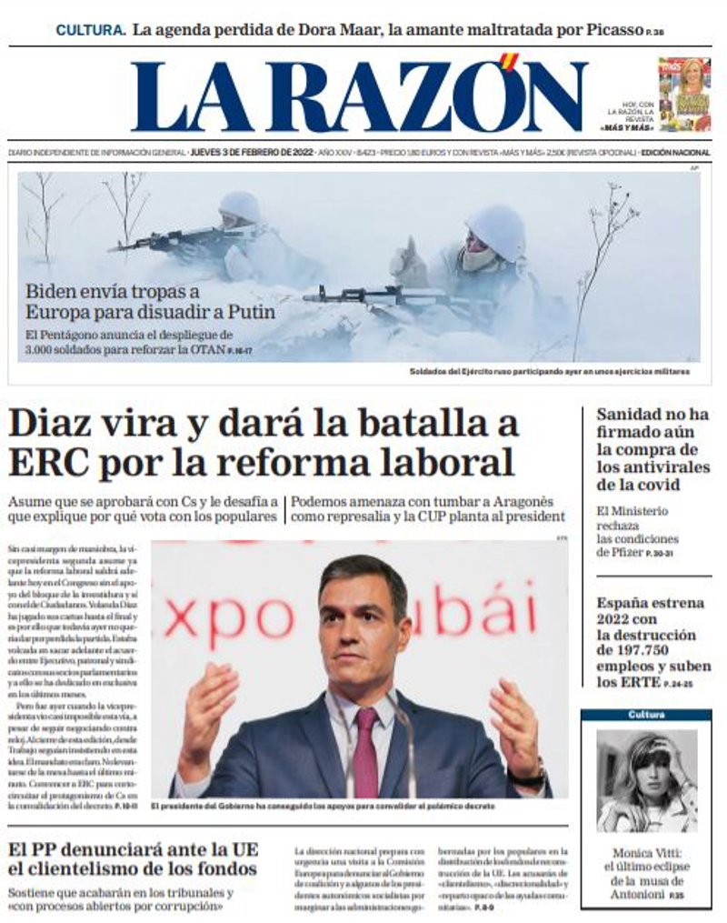LA RAZÓN: "Díaz vira y dará la batalla a ERC por la reforma laboral"; "El PP denunciará ante la UE el clientelismo de los fondos"; "Sanidad no ha firmado aún la compra de los antivirales de la covid"; "España estrena 2022 con la destrucción de 197.750 empleos y suben los ERTE"; "Biden envía tropas a Europa para disuadir a Putin".