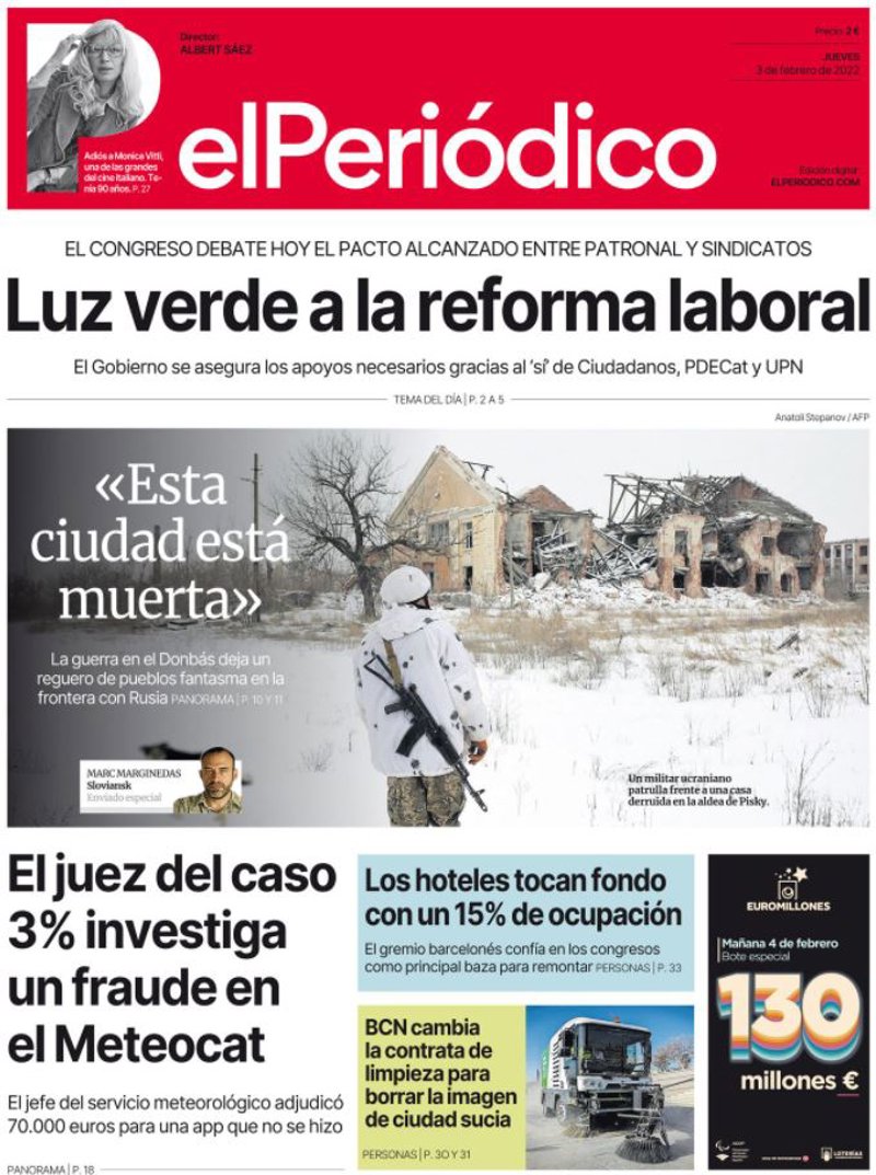 EL PERIÓDICO: "Luz verde a la reforma laboral"; "'Esta ciudad está muerta?'"; "El juez del caso 3% investiga un fraude en el Meteocat"; "Los hoteles tocan fondo con un 15% de ocupación"; "BNC cambia la contrata de limpieza para borrar la imagen de ciudad sucia".