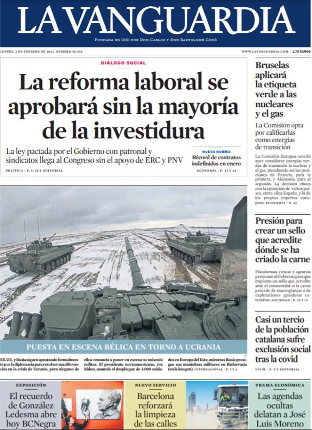 LA VANGUARDIA: "La reforma laboral se aprobará sin la mayoría de la investidura"; "Puesta en escena bélica en torno a Ucrania"; "Bruselas aplicará la etiqueta verde a las nucleares y el gas"; "Presión para crear un sello que acredite dónde se ha criado la carne"; "Casi un tercio de la población catalana sufre exclusión social tras la covid".