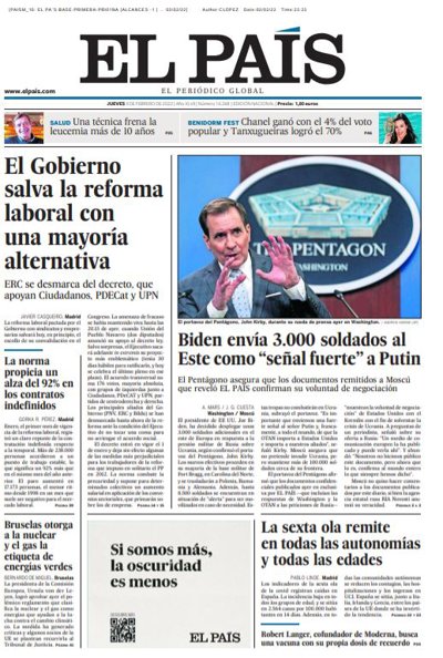 EL PAÍS: "El Gobierno salva la reforma laboral con una mayoría alternativa"; "Biden envía 3.000 soldados al Este como "señal fuerte" a Putin"; "La sexta ola remite en todas las autonomías y todas las edades"; "La norma propicia un alza del 92% en los contratos indefinidos"; "Bruselas otorga a la nuclear y el gas la etiqueta de energías verdes".