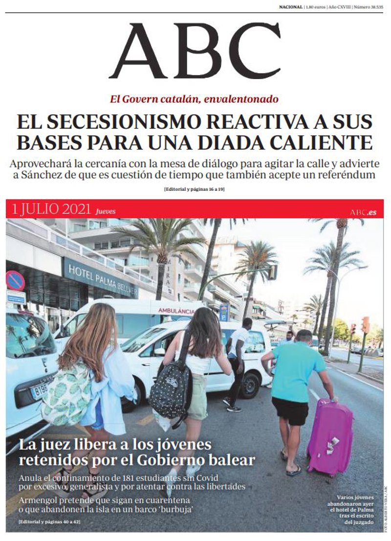 ABC: "El secesionismo reactiva a sus bases para una diada caliente. Aprovechará la cercanía con la mesa de diálogo para agitar la calle y advierte a Sánchez de que es cuestión de tiempo que también acepte un referéndum"; "La juez libera a los jóvenes retenidos por el Gobierno balear. Anula el confinamiento de 181 estudiantes sin Covid por excesivo, generalista y por atentar contra las libertades. Armengol pretende que sigan en cuarentena o que abandonen la isla en un barco 'burbuja'".