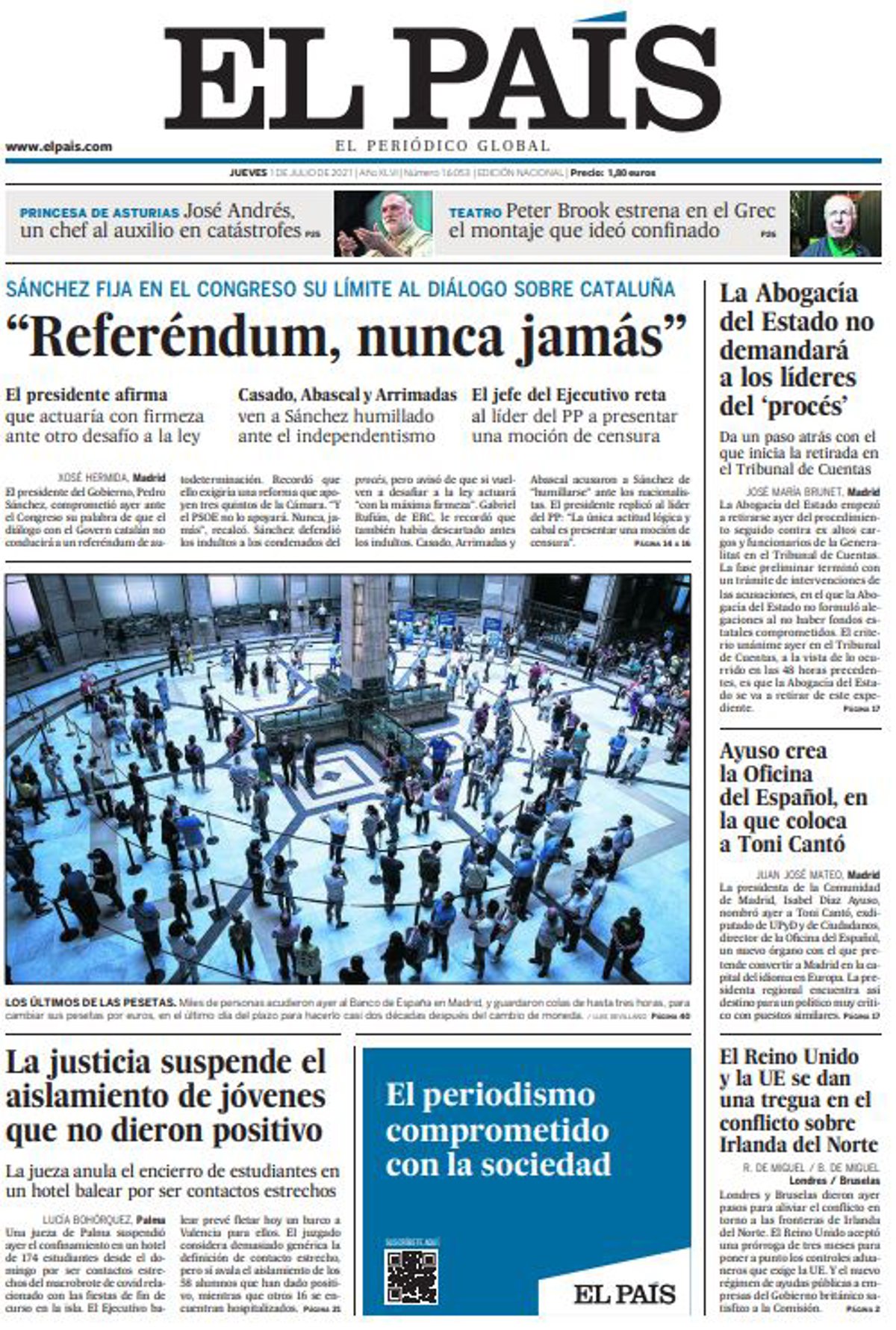 EL PAÍS: ""Referéndum, nunca jamás""; "La justicia suspende el aislamiento de jóvenes que no dieron positivo"; "La Abogacía del Estado no demandará a los líderes del 'procés'"; "Ayuso crea la Oficina del Español, en la que coloca a Toni Cantó"; "El Reino Unido y la UE se dan una tregua en el conflicto sobre Irlanda del Norte".