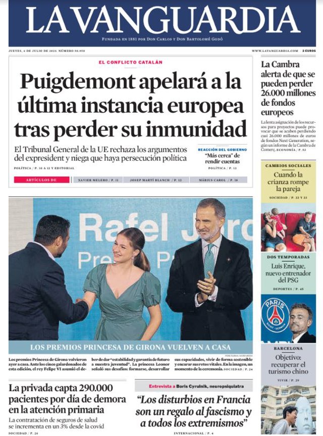 LA VANGUARDIA: "Puigdemont apelará a la última instancia europea tras perder su inmunidad"; "La Cambra alerta de que se pueden perder 26.000 millones de fondos europeos"; "La privada capta 290.000 pacientes por día de demora en la atención primaria".