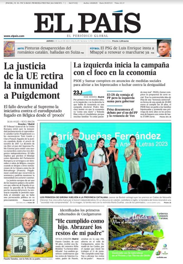 EL MUNDO: "Feijóo suma más que toda la izquierda pero Sánchez gana apoyos"; "La Comisión represnde a España por no despolitizar el Poder Judicial y la Fiscalía"; "Ni Interrail ni 'herencia' a los 18 años: PSOE y Sumar no conquistan el voto joven"; "Puigdemont maniobra para no ser entregado tras perder la inmunidad"; "Threads, el rival de Twitter, no se activará en la UE por la incertidumbre jurídica"; "Ventas récord de casas de lujo pese a caer un 6,7% el mercado inmobiliario".