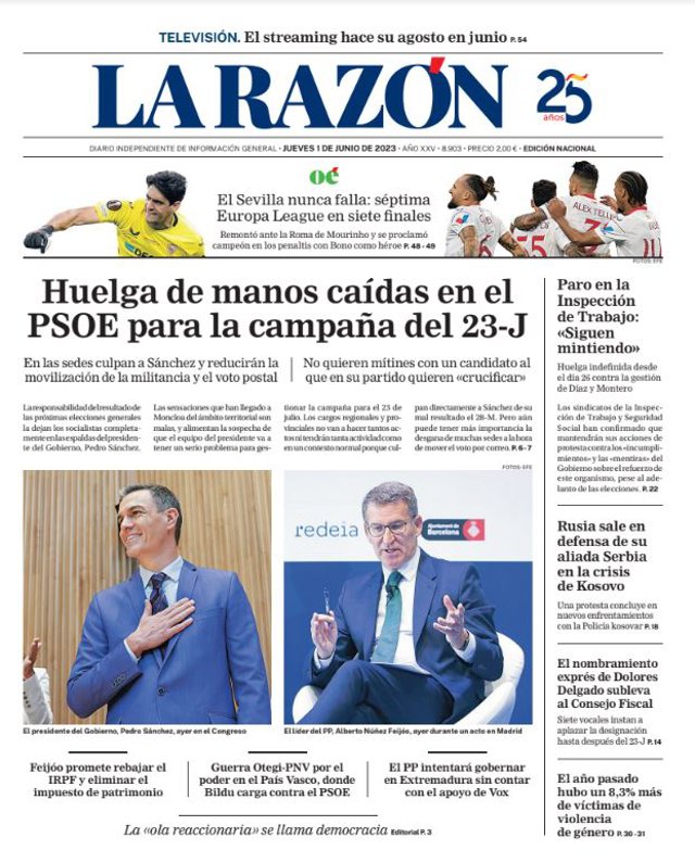 LA RAZÓN: "Huelga de manos caídas en el PSOE para la campaña del 23-J"; "Paro en la Inspección de Trabajo: Siguen mintiendo"; "Rusia sale en defensa de su aliada Serbia en la crisis de Kosovo"; "El nombramiento exprés de Dolores Delgado subleva al Consejo Fiscal"; "El año pasado hubo un 8,3% más de víctimas de violencia de género".