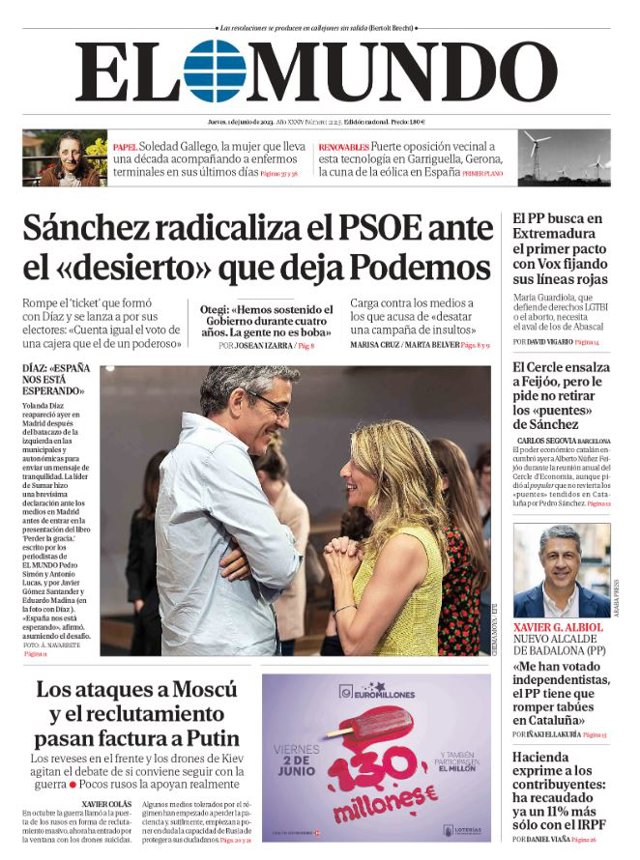 EL MUNDO: "Sánchez radicaliza el PSOE ante el desierto que deja Podemos"; "Los ataques a Moscú y el reclutamiento pasan factura a Putin"; "El PP busca en Extremadura el primer pacto con Vox fijando sus líneas rojas"; "El Cercle ensalza a Feijóo, pero le pide no retirar los puentes de Sánchez"; "García Albiol: Me han votado independentistas, el PP tiene que romper tabúes en Cataluña"; "Hacienda exprime a los contribuyentes: ha recaudado ya un 11% más sólo con el IRPF".