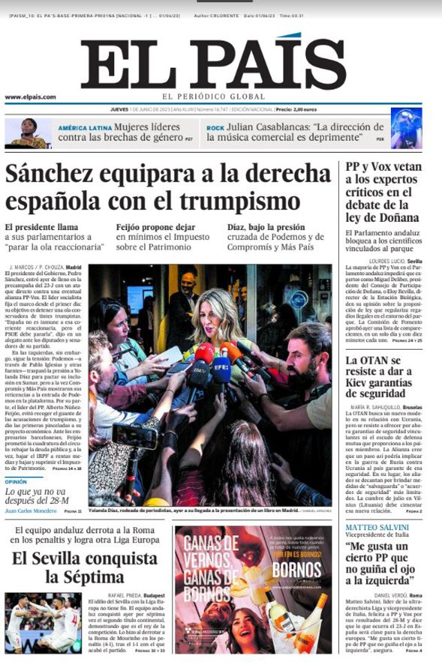 EL PAÍS: "Sánchez equipara a la derecha española con el trumpismo"; "PP y Vox vetan a los expertos críticos en el debate de la ley de Doñana"; "La OTAN se resiste a dar a Kiev garantías de seguridad"; "El Sevilla conquista la Séptima"; "Mateo Salvini: Me gusta un cierto PP que no guiña el ojo a la izquierda".