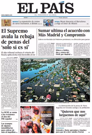 EL PAÍS: "El Supremo avala la rebaja de penas del 'solo sí es sí'"; "Sumar ultima el acuerdo con Más Madrid y Compromís"; "La OCDE se suma a las revisiones al alza del PIB español"; "Las trampas de algunas inmobiliarias para cobrar de más al inquilino"; ""Quieren que nos larguemos de aquí"".