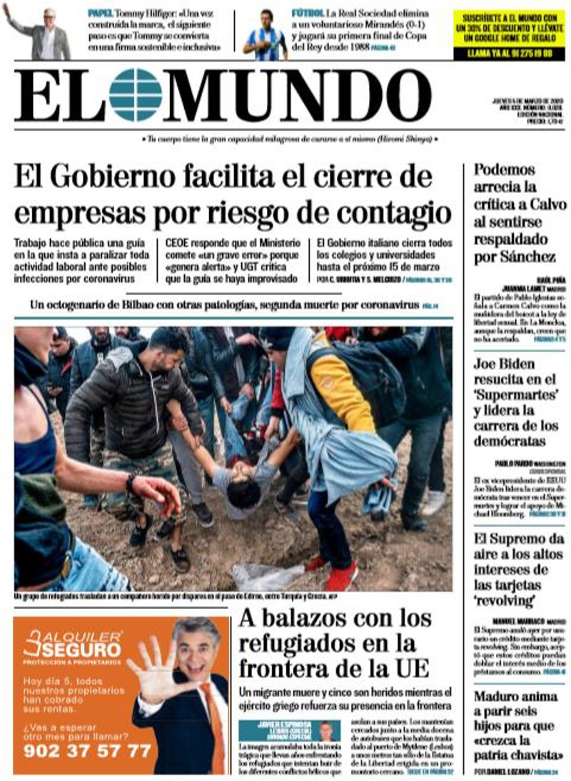 EL MUNDO: "El Gobierno facilita el cierre de empresas por riesgo de contagio"; "A balazos con los refugiados en la frontera de la UE"; "Podemos arrecia la crítica a Calvo al sentirse respaldado por Sánchez"; "Joe Biden resucita en el 'Supermartes' y lidera la carrera de los demócratas"; "El Supremo da aire a los altos intereses de las tarjetas 'revolving'"; "Maduro anima a parir seis hijos para que "crezca la patria chavista".