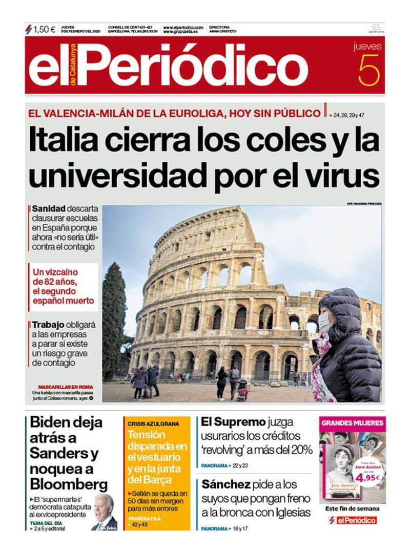 EL PERIÓDICO: "Italia cierra los coles y la universidad por el virus"; "Bilden deja atrás a Sanders y noquea a Bloomberg"; "El Supremo juzga usurarios los créditos 'revolving' a mas del 20 por ciento"; "Sánchez pide a los suyos que pongan freno a la bronca con Iglesias".