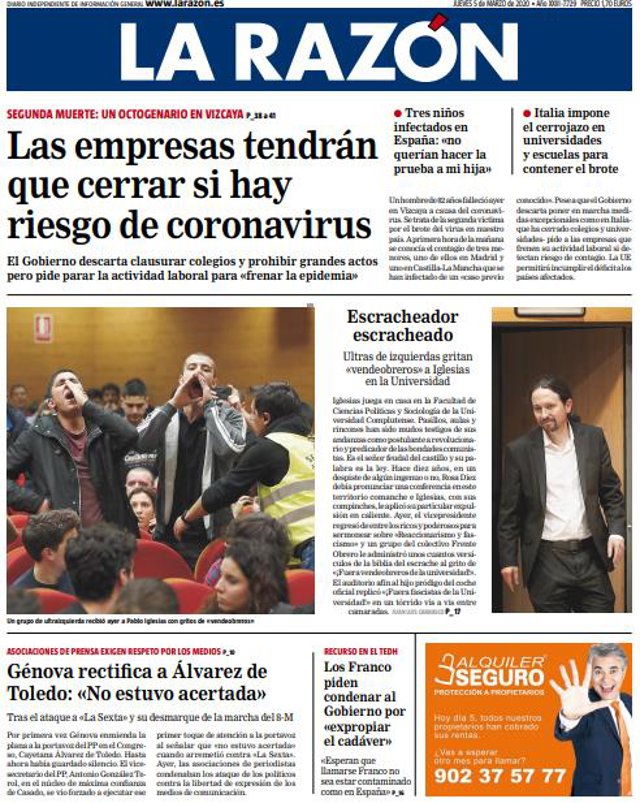 LA RAZÓN: "Las empresas tendrán que cerrar si hay riesgo de coronavirus"; "Escracheador escracheado"; "Génova rectifica a Álvarez de Toledo: "No estuvo acertada""; "Los Franco piden condenar al Gobierno por "expropiar el cadáver"".