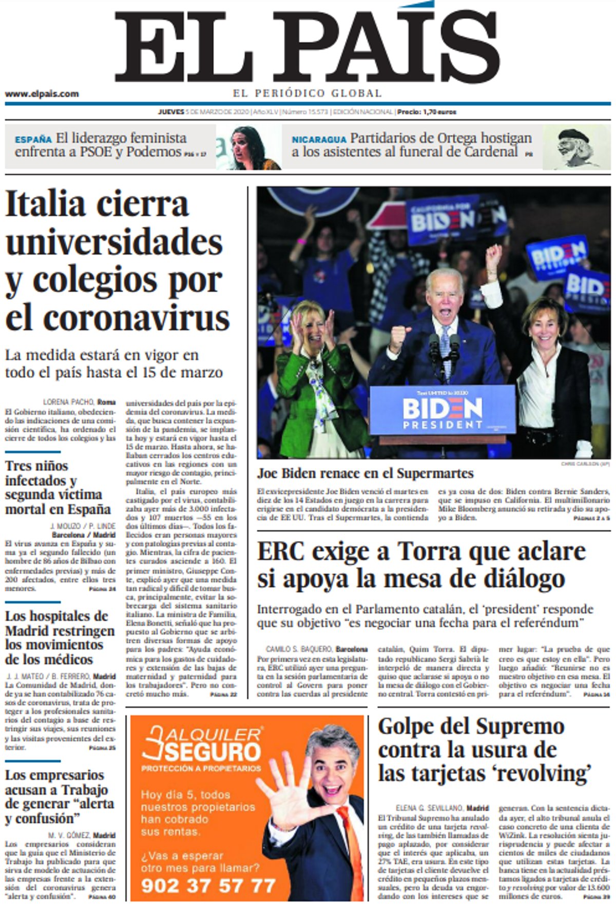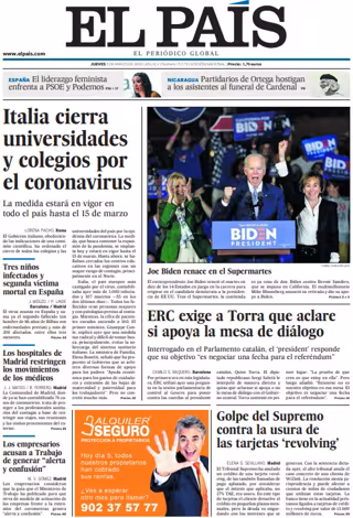 EL PAÍS: "Italia cierra universidades y colegios por el coronavirus"; "Tres niños infectados y segunda víctima mortal en España"; "Los hospitales de Madrid restringen los movimientos de los médicos"; "Los empresarios acusan a Trabajo de generar "alerta y confusión"; "Joe Biden renace en el Supermartes"; "ERC exige a Torra que aclare si apoya la mesa de diálogo"; "Golpe del Supremo contra la usura de las tarjetas 'revolving'".