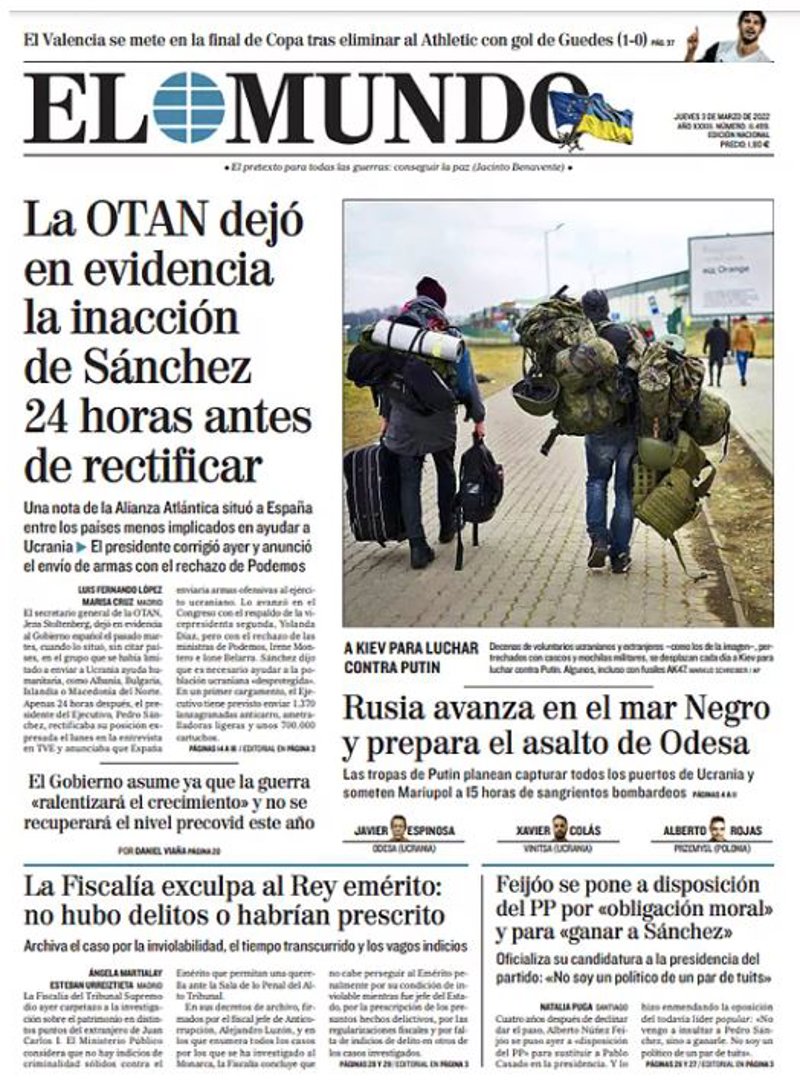 EL MUNDO: "La OTAN dejó en evidencia la inacción de Sánchez 24 horas antes de rectificar"; "Rusia avanza en el mar Negro y prepara el asalto de Odesa"; "El Gobierno asume ya que la guerra "ralentizará el crecimiento" y no se recuperará el nivel precovid este año"; "La Fiscalía exculpa al Rey emérito: no hubo delitos o habrían prescrito"; "Feijóo se pone a disposición del PP por "obligación moral" y para "ganar a Sánchez"".