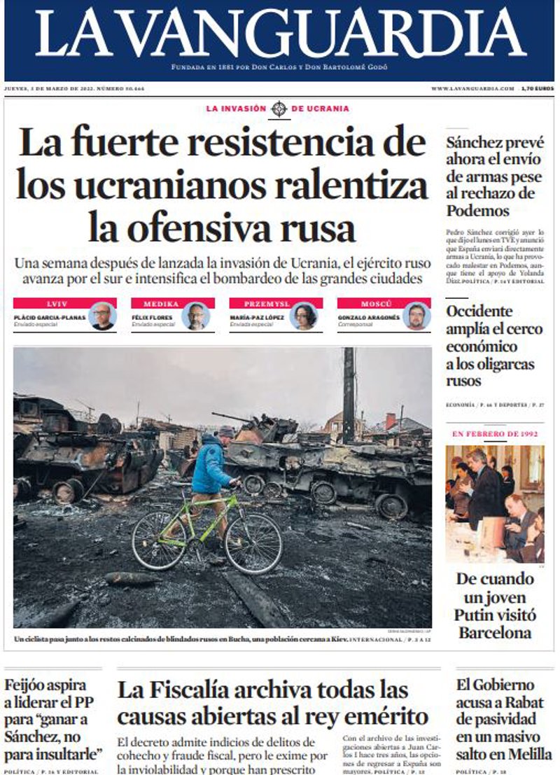 LA VANGUARDIA: "La fuerte resistencia de los ucranianos ralentiza la ofensiva rusa"; "La Fiscalía archiva todas las causas abiertas al rey emérito"; "Feijóo aspira a liderar el PP para "ganar a Sánchez, no para insultarle""; "Sánchez prevé ahora el envío de armas pese al rechazo de Podemos"; "Occidente amplía el cerco económico a los oligarcas rusos"; "De cuando un joven Putin visitó Barcelona"; "El Gobierno acusa a Rabat de pasividad en un masivo salto en Melilla".