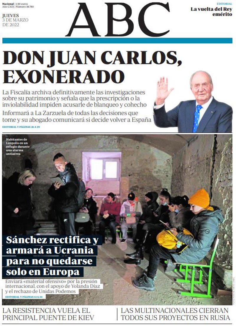 ABC: "Don Juan Carlos, exonerado. La Fiscalía archiva definitivamente las investigaciones sobre su patrimonio y señala que la prescripción o la inviolabilidad impiden acusarle de blanqueo y cohecho. Informará a La Zarzuela de todas las decisiones que tome y su abogado comunicará si decide volver a España"; "Sánchez rectifica y armará a Ucrania para no quedarse solo en Europa. Enviará "material ofensivo" por la presión internacional, con el apoyo de Yolanda Díaz y el rechazo de Unidas Podemos".