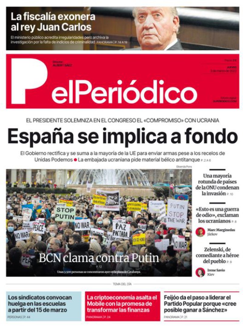 EL PERIÓDICO: "España se implica a fondo"; "La fiscalía exonera al rey Juan Carlos"; "BCN clama contra Putin"; "Los sindicatos convocan huelga en las escuelas a partir del 15 de marzo"; "La criptoeconomía asalta el Mobile con la promesa de transformar las finanzas"; "Feijóo da el paso a liderar el Partido Popular porque "cree posible ganar a Sánchez"".
