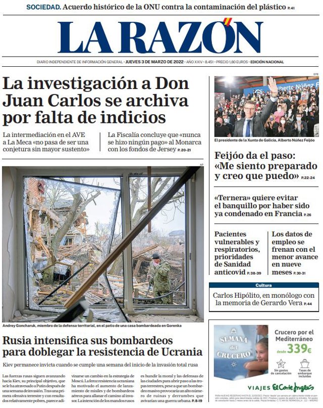 LA RAZÓN: "La investigación a Don Juan Carlos se archiva por falta de indicios"; "Rusia intensifica sus bombardeos para doblegar la resistencia de Ucrania"; "Feijóo da el paso: "Me siento preparado y creo que puedo""; ""Ternera" quiere evitar el banquillo por haber sido ya condenado en Francia"; "Pacientes vulnerables y respiratorios, prioridades de Sanidad anticovid"; "Los datos de empleo se frenan con el menor avance en nueve meses".