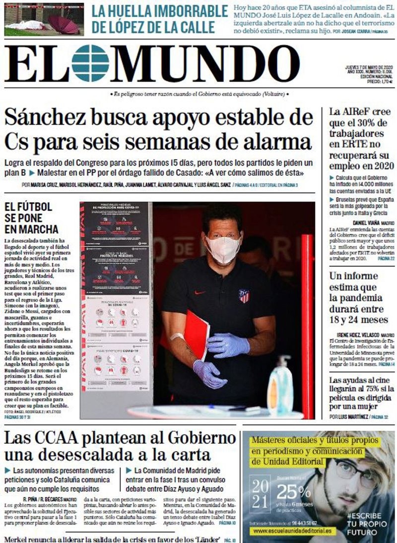 EL MUNDO: "Sánchez busca apoyo estable de Cs para seis semanas de alarma"; "Las CCAA plantean al Gobierno una desescalada a la carta"; "Merkel renuncia a liderar la salida de la crisis en favor de los 'Länder'"; "La AIReF cree que el 30% de trabajadores en ERTE no recuperará su empleo en 2020"; "Un informe estima que la pandemia durará entre 18 y 24 meses"; "Las ayudas al cine llegarán al 75% si la película es dirigida por una mujer".