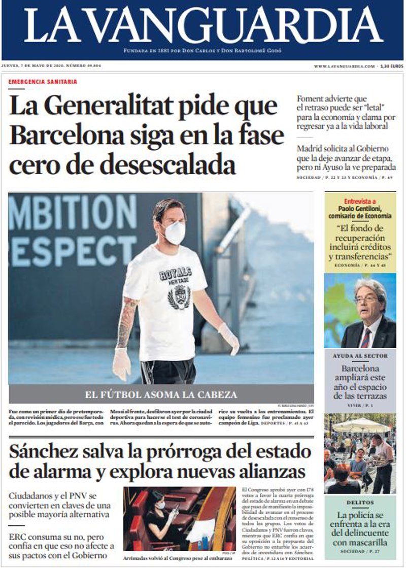 LA VANGUARDIA: "La Generalitat pide que Barcelona siga en la fase cero de desescalada"; "Sánchez salva la prórroga del estado de alarma y explora nuevas alianzas"; "Entrevista a Paolo Gentiloni, comisario de Economía: "El fondo de recuperación incluirá créditos y transferencias"; "Barcelona ampliará este año el espacio de las terrazas"; "La policía se enfrenta a la era del delincuente con mascarilla".