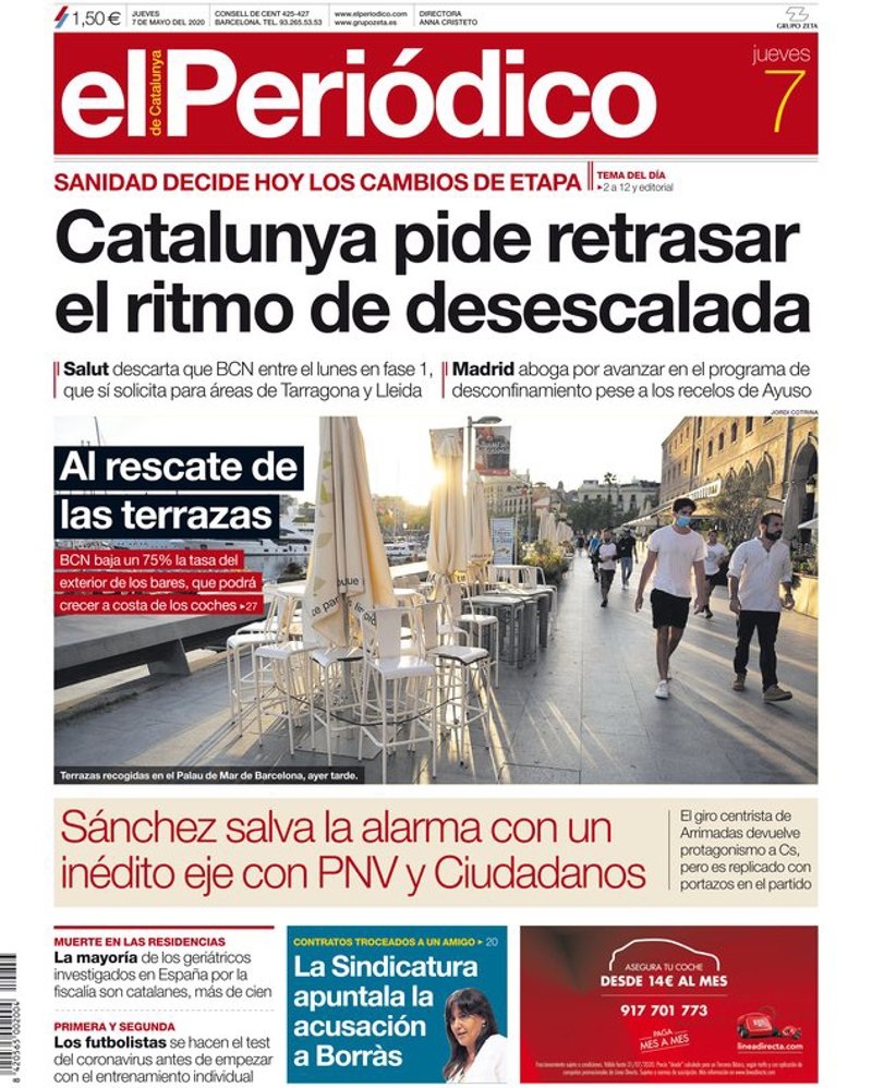 EL PERIÓDICO: "Cataluña pide retrasar el ritmo de la desescalada"; "Al rescate de las terrazas. Barcelona baja un 75% la tasa del exterior de los bares, que podrá crecer a costa de los coches"; "Sánchez salva la alarma con un inédito eje con PNV y Ciudadanos"; "La mayoría de los geriátricos investigados en España por la fiscalía son catalanes, más de cien"; "Los futbolistas se hacen el test del coronavirus antes de empezar con el entrenamiento individual".
