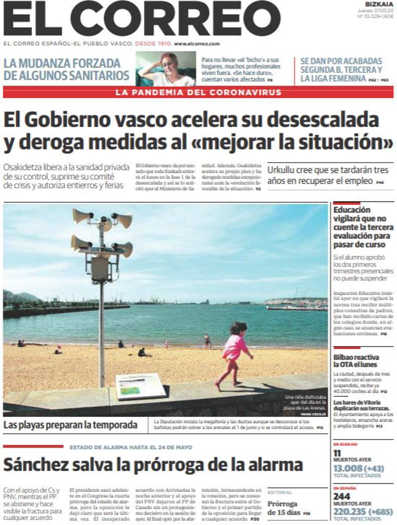 EL CORREO: "El Gobierno vasco acelera su desescalada y deroga medidas al "mejorar la situación""; "Sánchez salva la prórroga de la alarma"; "Educación vigilará que no cuente la tercera evaluación para pasar de curso".